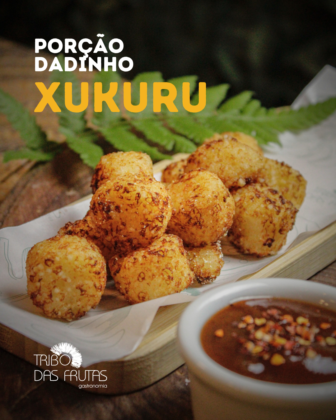 Porção de batata frita dourada e crocante, acompanhada do irresistível molho Tribo.