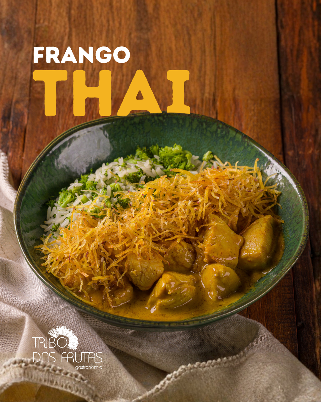 Uma fusão deliciosa que combina os sabores exóticos da Tailândia com um toque brasileiro. O frango é preparado ao estilo Thai, marinado em uma mistura de leite de coco e curry tailandês, acompanhado de arroz com brócolis e para adicionar uma textura crocante e um contraste perfeito, o prato é finalizado com batata-doce palha.