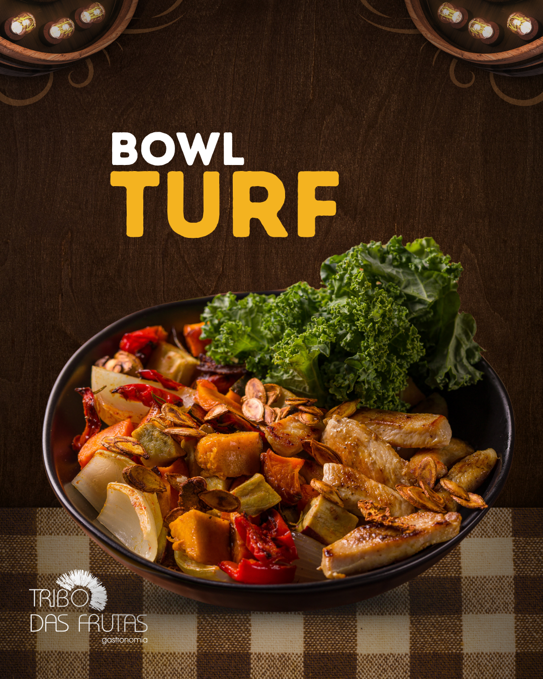 Este prato combina ingredientes assados com perfeição, como abóbora, batata-doce, cenoura e cebola. Frango em cubos grelhado, couve kale e um toque crocante de sementes. Tudo isso é finalizado com um molho de mostarda e mel, que une o doce e o picante em um equilíbrio perfeito.