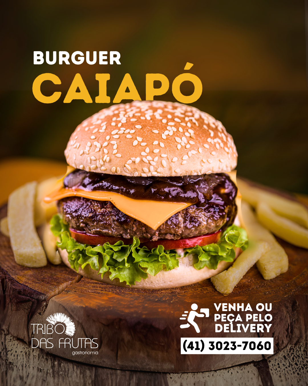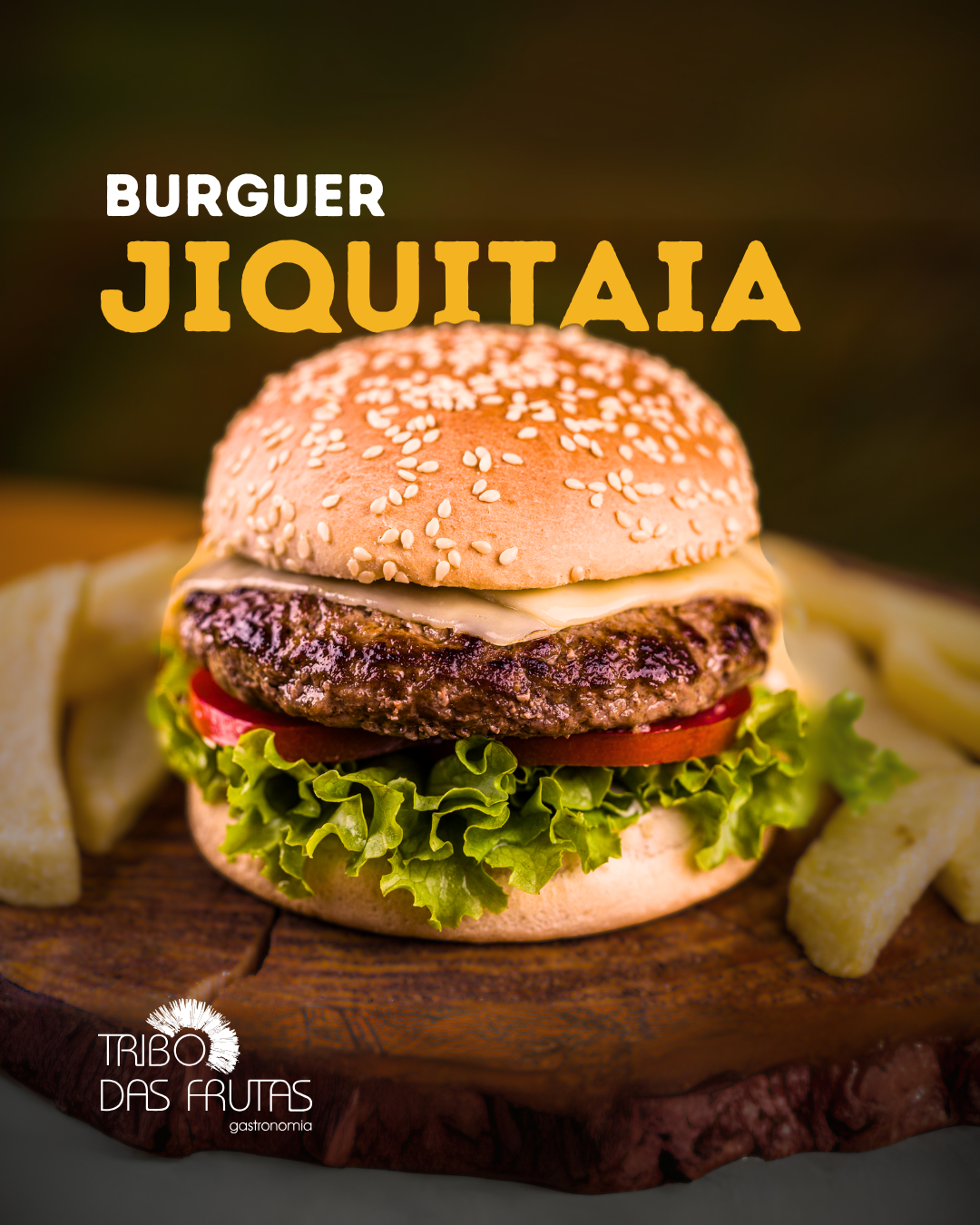 Pão de hambúrguer, com um suculento hambúrguer artesanal, queijo cheddar, alface e tomate, este hambúrguer é servido com uma porção de batatas fritas e acompanha a exclusiva maionese Tribo.