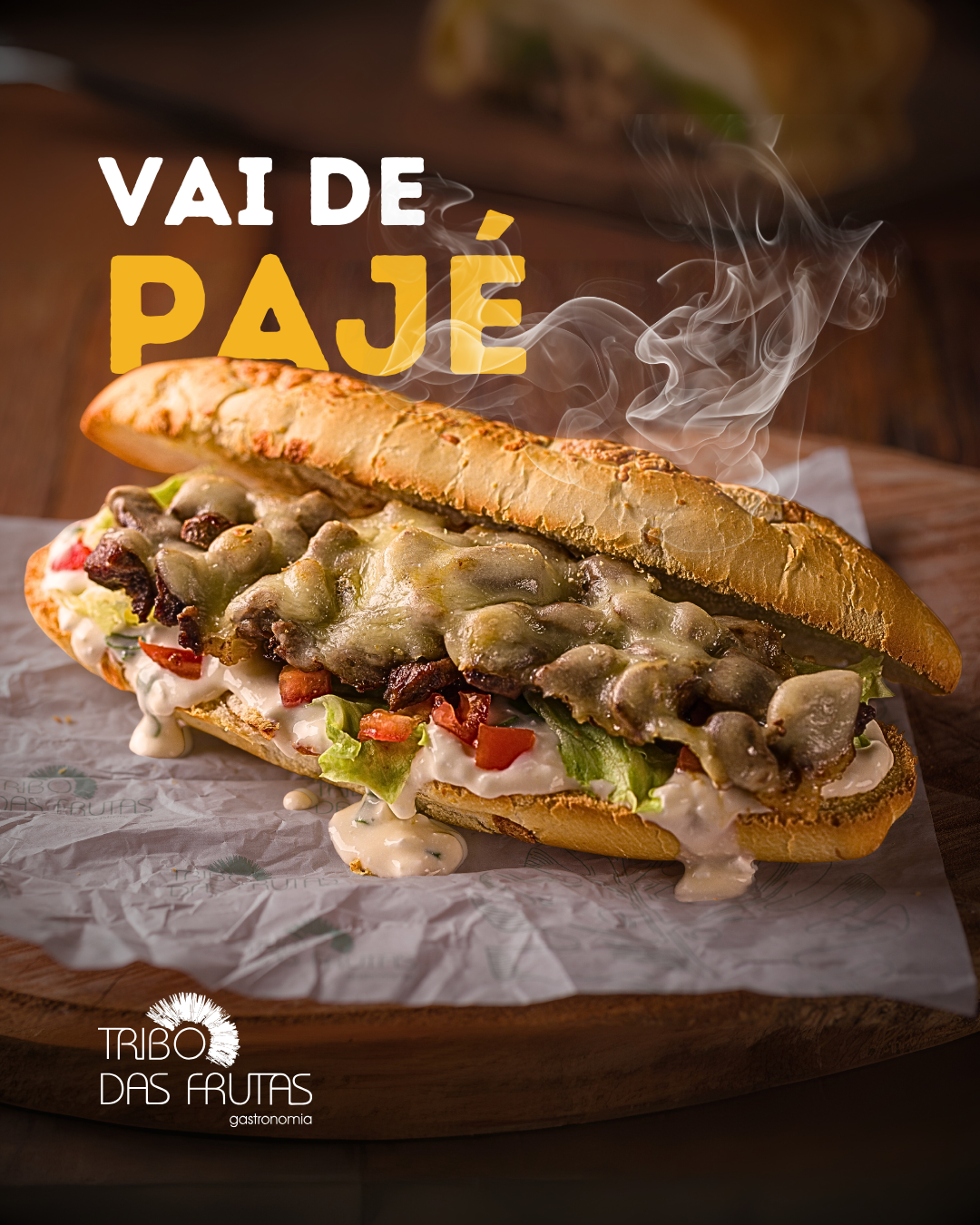 Pão baguete recheado com mignon, creme de cottage, alface americana fresca, tomate e queijo mussarela derretido, criando uma harmonização perfeita.